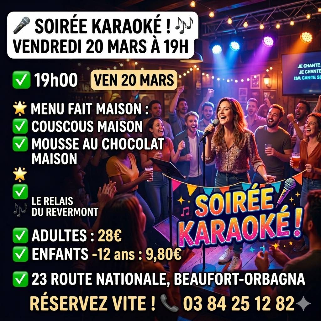L’établissement Beaufort-Orbagna vous invite à une soirée karaoké conviviale le vendredi 20 mars 2026 à 19h ! Venez chanter, partager un bon moment et profiter d’un délicieux menu fait maison..